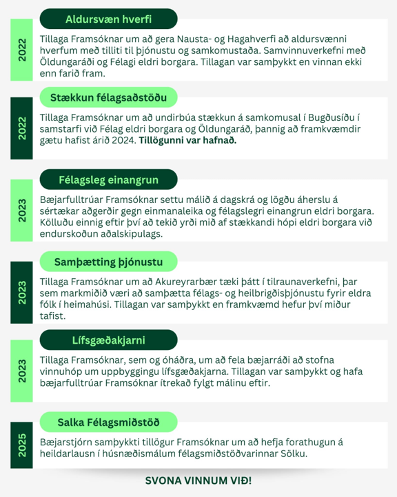 Við þökkum hvatninguna og viljum nýta tækifærið til að fara yfir þau mál sem við, bæjarfulltrúar Framsóknar á Akureyri, höfum beitt okkur fyrir þegar kemur að málefnum eldri borgara á þessu kjörtímabili.