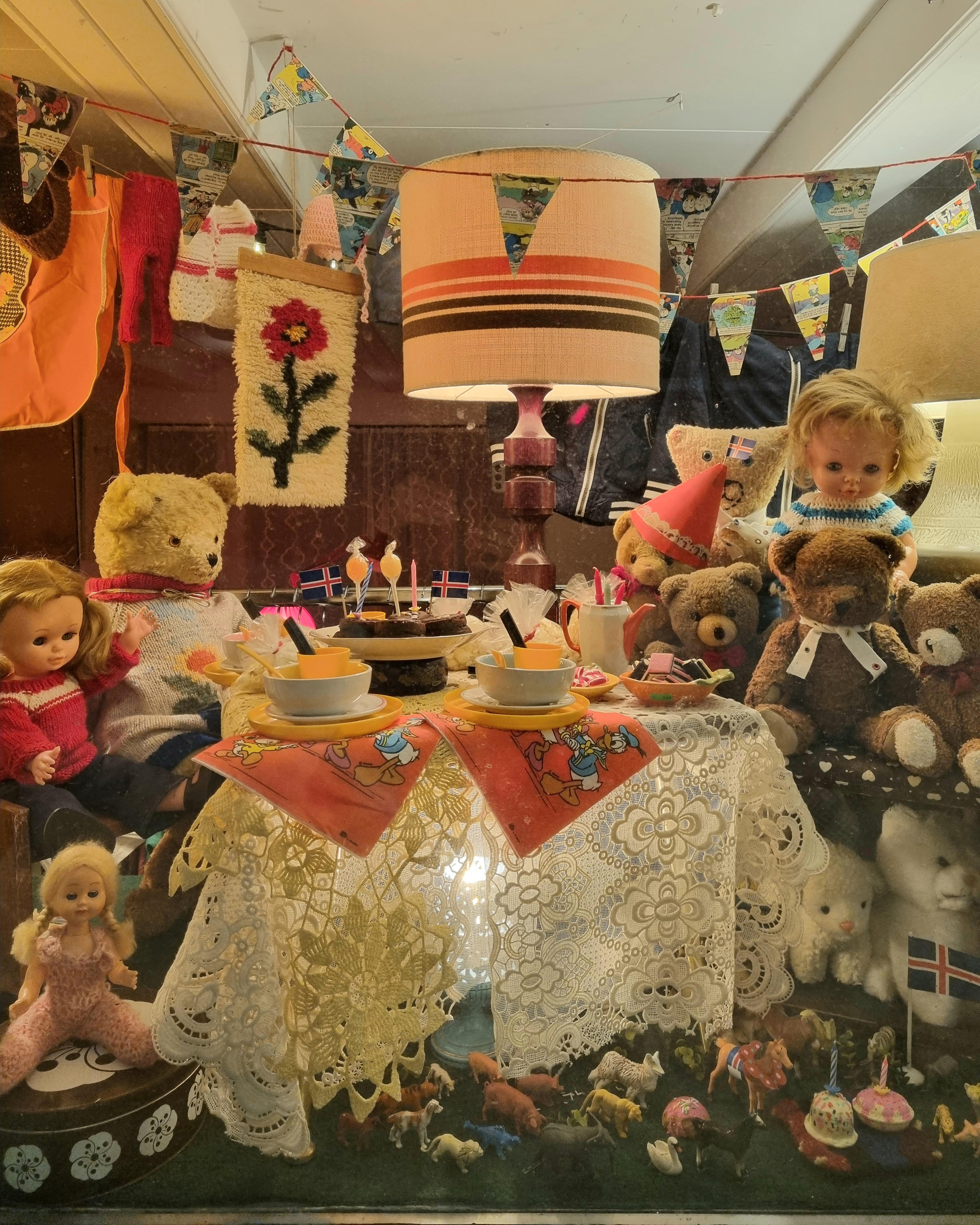 Boðið er í fjórfalt afmæli, bangsa-, dúkku-, dýra- og barnaafmæli. Það glittir í sumarkomuna, sætar kökur og snúða á uppdekkuðum borðum og gjafirnar eru ekki af verri endanum, ýmis leikföng og annað góss. Efniviður sýningarinnar er endurnýtt dót m.a. frá skrautmunasölunni Fröken Blómfríður og nytjamörkuðum. Sýningin er kjörinn áfangastaður í gönguferðum, gott tækifæri til að staldra við, leika sér og vekur eflaust upp forvitni og gleði hjá vegfarendum.