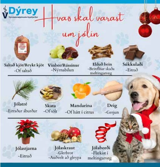 „Ef hundurinn er vanur að taka upp rusl eða aðra hluti af götunni þarf að passa þá sérstaklega um hátíðirnar. Hundar eru sérstaklega líklegir til að grípa mat í pakkningu og borða plastið með matnum. Einnig getur verið gott að geyma jólagjafir þar sem hundurinn nær ekki til eða dreifa huga hundsins með því að leika við hann.“