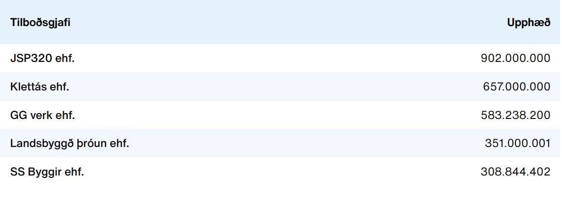 Útboðinu lauk kl. 12:00 þann 12. mars 2026 en alls bárust tilboð frá fimm lögaðilum í byggingarréttinn. Hæstbjóðandi reyndist vera JSP320 ehf. með tilboð upp á kr. 902.000.000,-.