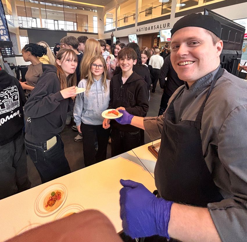 Theódór Sölvi Haraldsson matreiðslumaður hjá Samherja sá um að matreiða Besta bitann og myndaðist strax biðröð nemenda sem vildu gæða sér á þessari ljúffengu og næringarríku afurð.