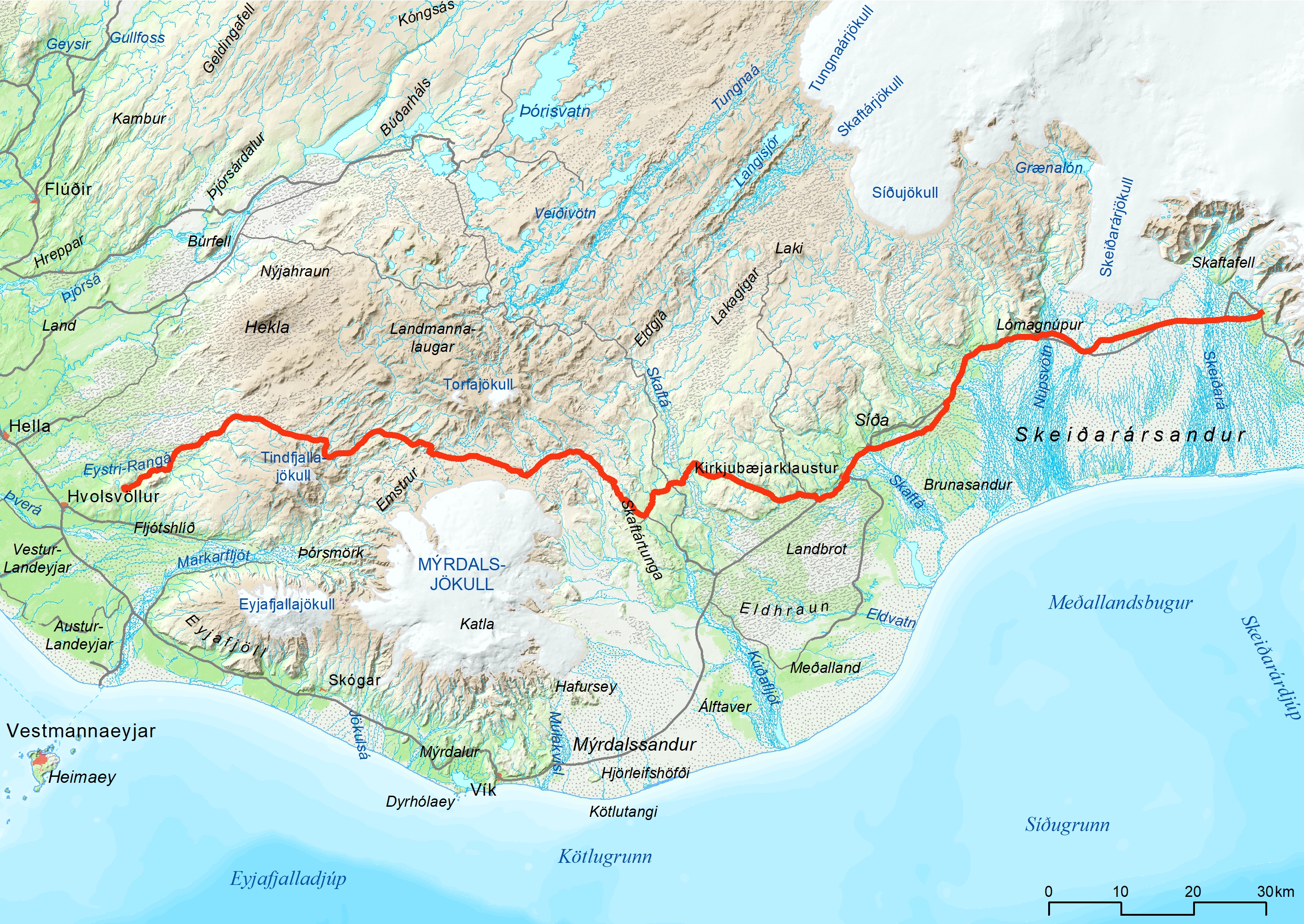 Við riðum af stað snemma á drottinsdegi eins og segir í Njálu. Við riðum vestur Lómagnúpssandinn eins og hann hét á söguöld en heitir nú Skeiðarársandur. Ég hafði ákveðið að áfangaskipta ferðinni og hugsaði mér að 30 kílómetra áfangar væru hæfilegir og haldið yrði vel áfram og ekki stoppað mikið nema til þess að skipta um hesta.