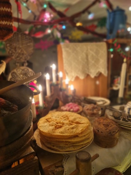 Litið er inn á heimili frá fyrri hluta síðustu aldar. Heimilisfólkið er gengið til náða og töfrar jólanna færast hljóðlega yfir bæinn. Stjörnubjartur himinn lýsir upp umhverfið, glansandi rauð epli bíða í skál, nýsteikt laufabrauð og hangikjötsflís hvíla á diski og sofandi kisur á sæng. Búið er að skreyta m.a. með litríkum músastigum og heimagerðu jólatré.