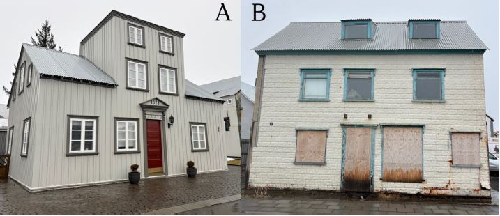 Hér sjáum við mynd þar sem Hús A er stórkostlegt dæmi um snyrtilega uppgert hús á Eyrinni og hefur það eflaust vakið athygli ferðafólks. Hús B er því miður dæmi um hið andstæða, a.m.k. enn sem komið er.