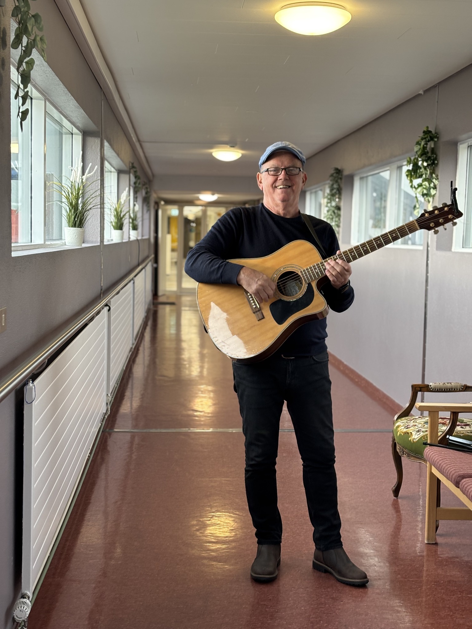 „Og svo á meðan umferðin er að þorna þá hendir maður sér í að spila eitt eða tvö lög á gítarinn, svo heldur maður áfram þegar það er þornað. Það er þannig með vatnslitina, maður þarf alltaf að bíða á milli,“ segir Frímann ennfremur en gítarinn hefur hann alltaf haft nærri sér frá því hann var tíu ára gamall.