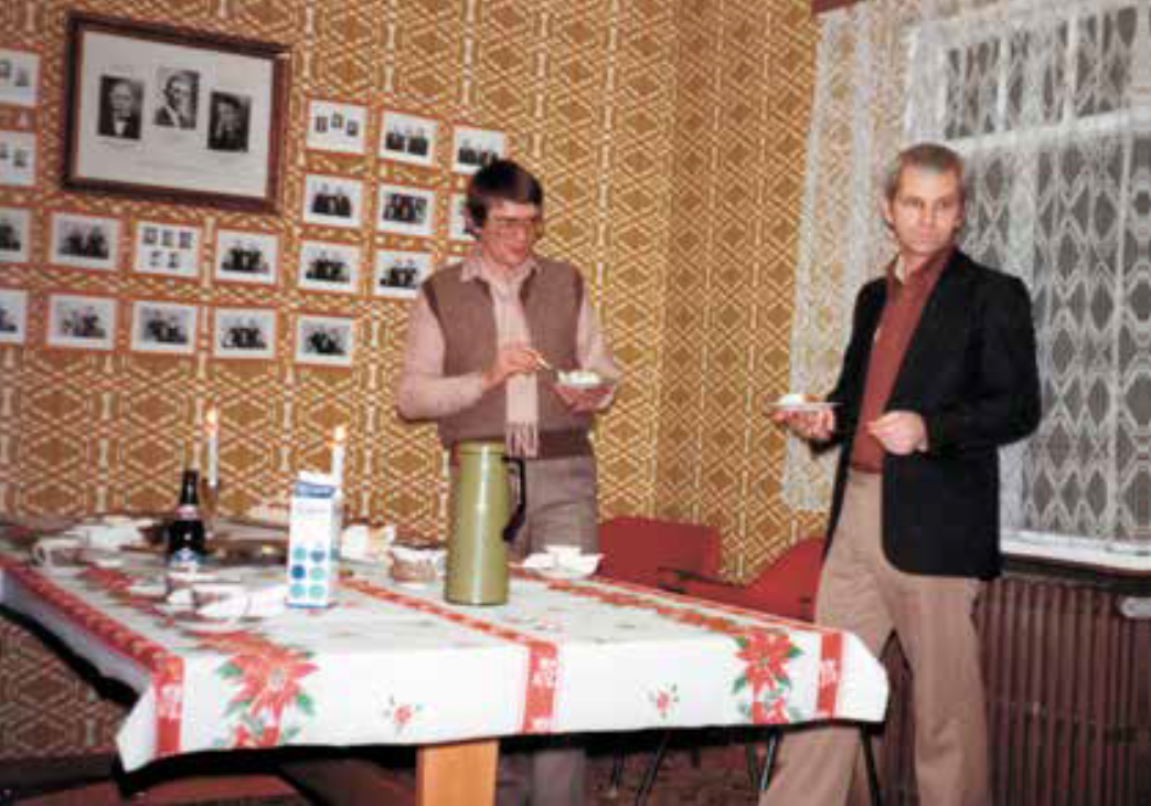 Tveir fyrrum formenn FVSA, Kolbeinn Sigurbjörnsson t.v. og Guðmundur Björnsson í jólakaffi hjá félaginu sínu á skrifstofunni í Brekkugötu 4