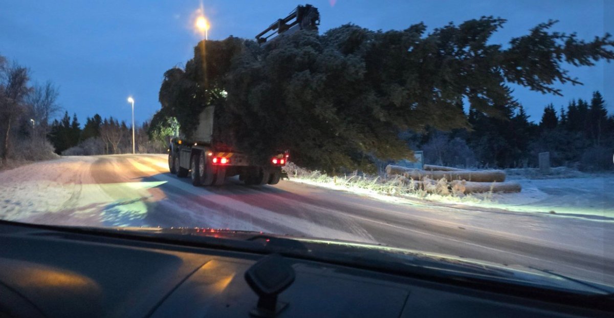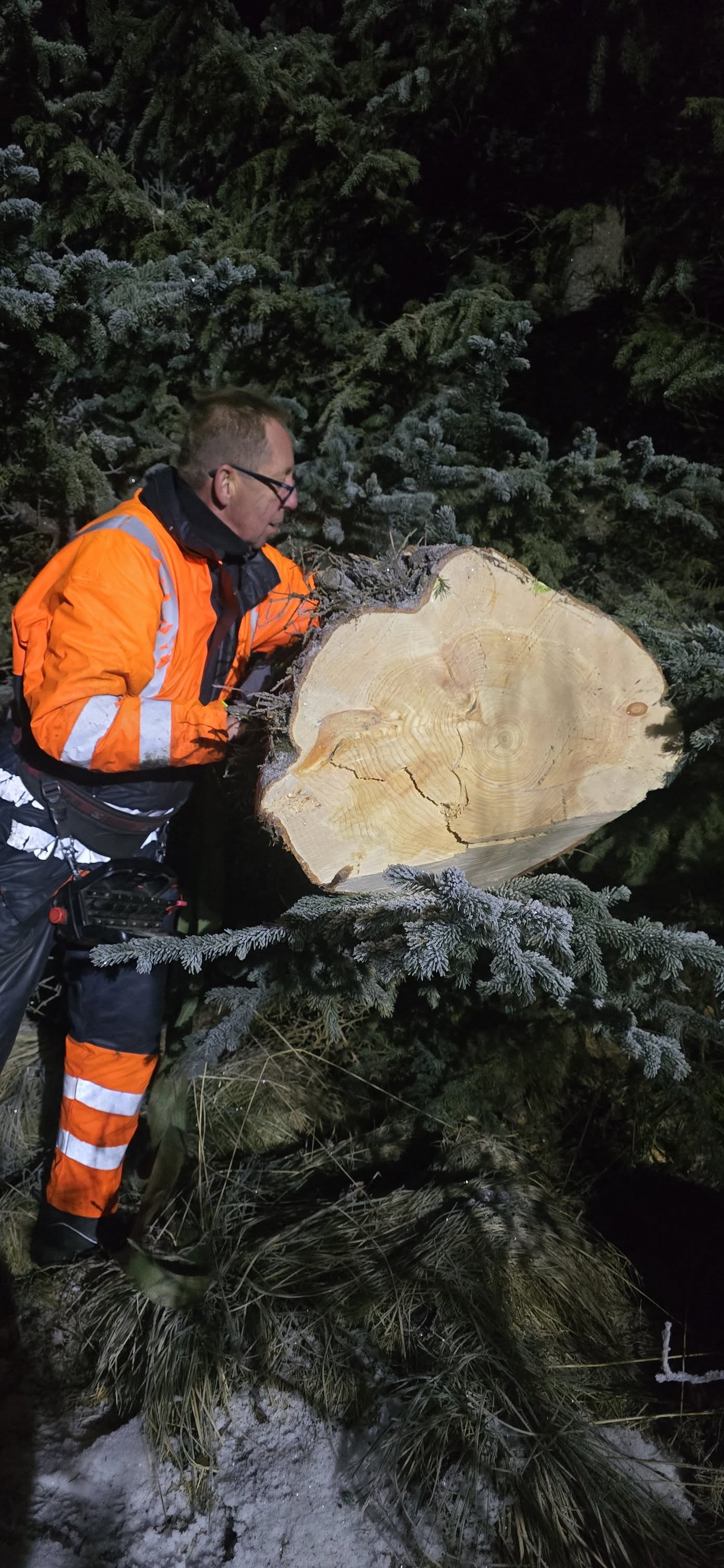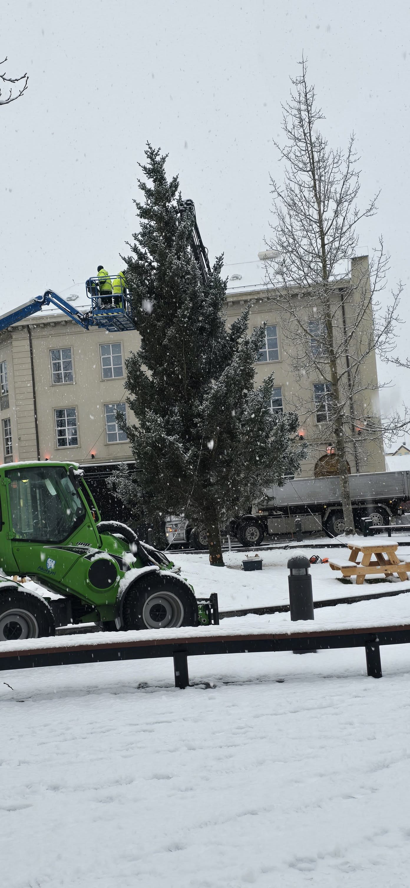 Dagurinn okkar hófst á að koma þess glæsilega sitkagreni úr Kjarnaskógi niður í bæ og nutum við þar aðstoðar Viðars Pálmasonar sem er snillingur á kranabíl veit allt um stroffur og leysti erfitt verkefni frábærlega, takk Viddi, þetta hefðum við aldrei getað án þín.