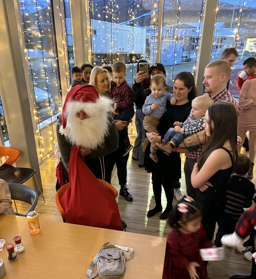 „Við búum svo vel að hafa góðan matsal sem rúmar okkur öll. Þetta var falleg samvera og bara yndislegt að gleðjast og syngja saman jólalög. Hérna starfar fólk frá ýmsum þjóðlöndum og jólahefðirnar eru þess vegna mismunandi. Í ár var það Askasleikir sem var svo elskulegur að koma í heimsókn. Hann varð að vísu að láta sig hafa það að vera í gömlu fötunum sínum vegna þess að gat kom á nýju fötin og Grýla hafði ekki stagað í þau. Askasleikir var með gjafir til allra sem vöktu mikla lukku. Það er aldeilis ekki á hverjum degi sem mannfólkið kemst í návígi við jólasveinana.“