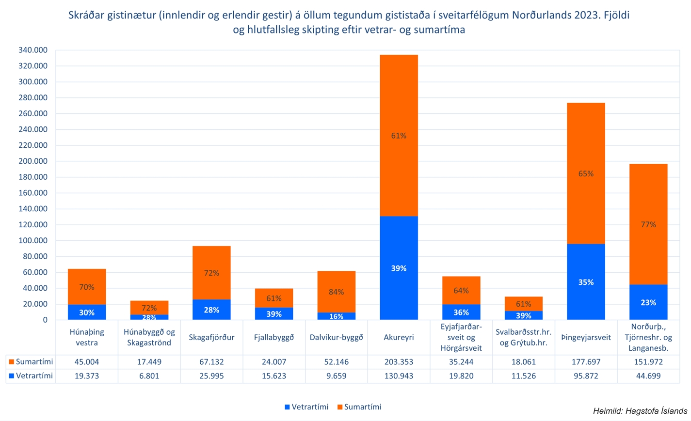 Tölur um gistinætur árið 2023 á Norðurlandi eystra frá Hagstofunni sýna að nú þegar er ferðaþjónusta í Þingeyjarsveit að skila góðum árangri, og er í raun ekki langt frá Akureyri á stöplaritinu hér að neðan. Gistinætur að sumri eru merktar með appelsínugulu, en veturinn með bláu.