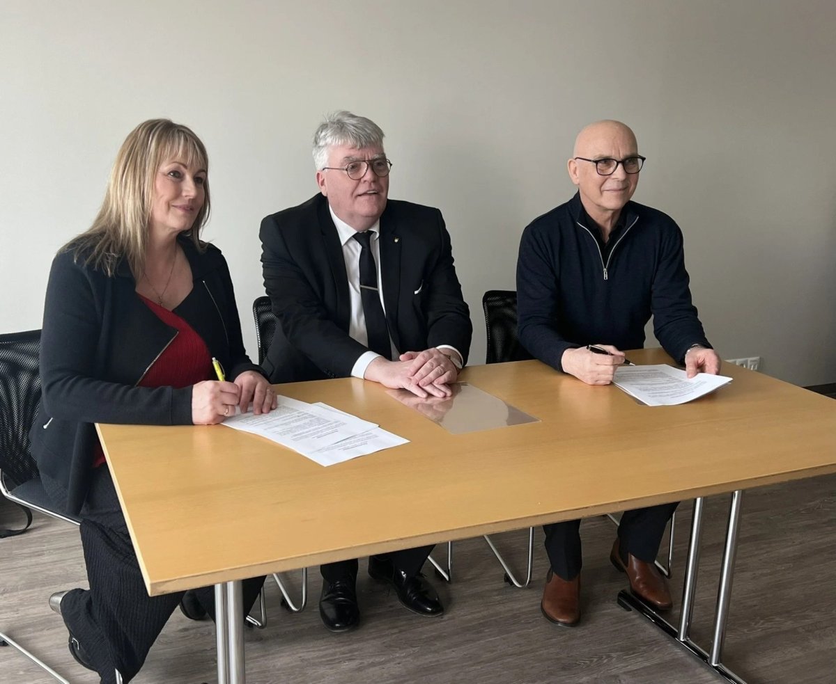 Pálína S. Halldórsdóttir framkvæmdastjóri Grófarinnar Geðræktar, Heiðar Friðjónsson formaður framkvæmdaráðs StLO, Pétur Þór Jónasson formaður Krabbameinsfélags Akureyrar og nágrennis skrifa undir samning um húsnæði við Glerárgötu 24. KAON er á þriðju hæð hússins og Grófin á þeirri fjórðu