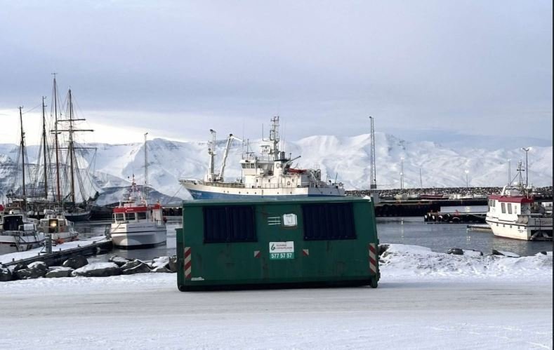 Búið er að koma fyrir gám fyrir flugeldarusl á Húsavík, gámurinn er staðsettur niðri á Hafnarstétt