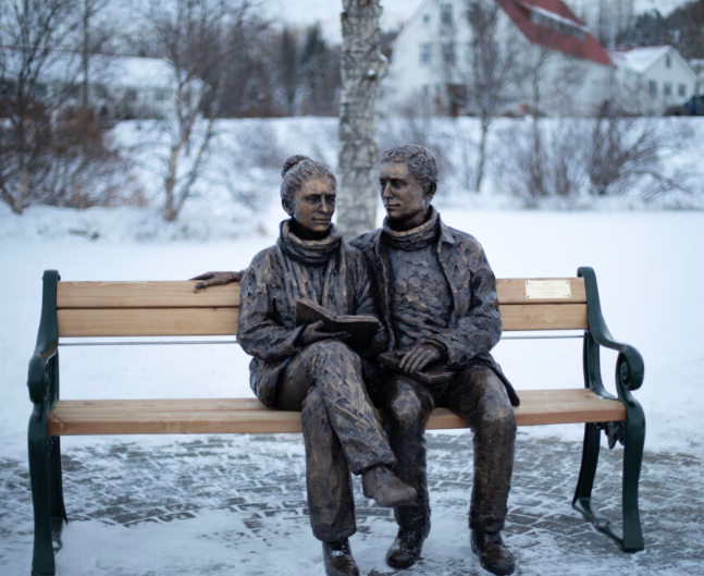 Laugaparið, bronsstytta af pilti og stúlku var afhjúpuð á Laugum í 100 ára afmælisveislu Laugaskóla.