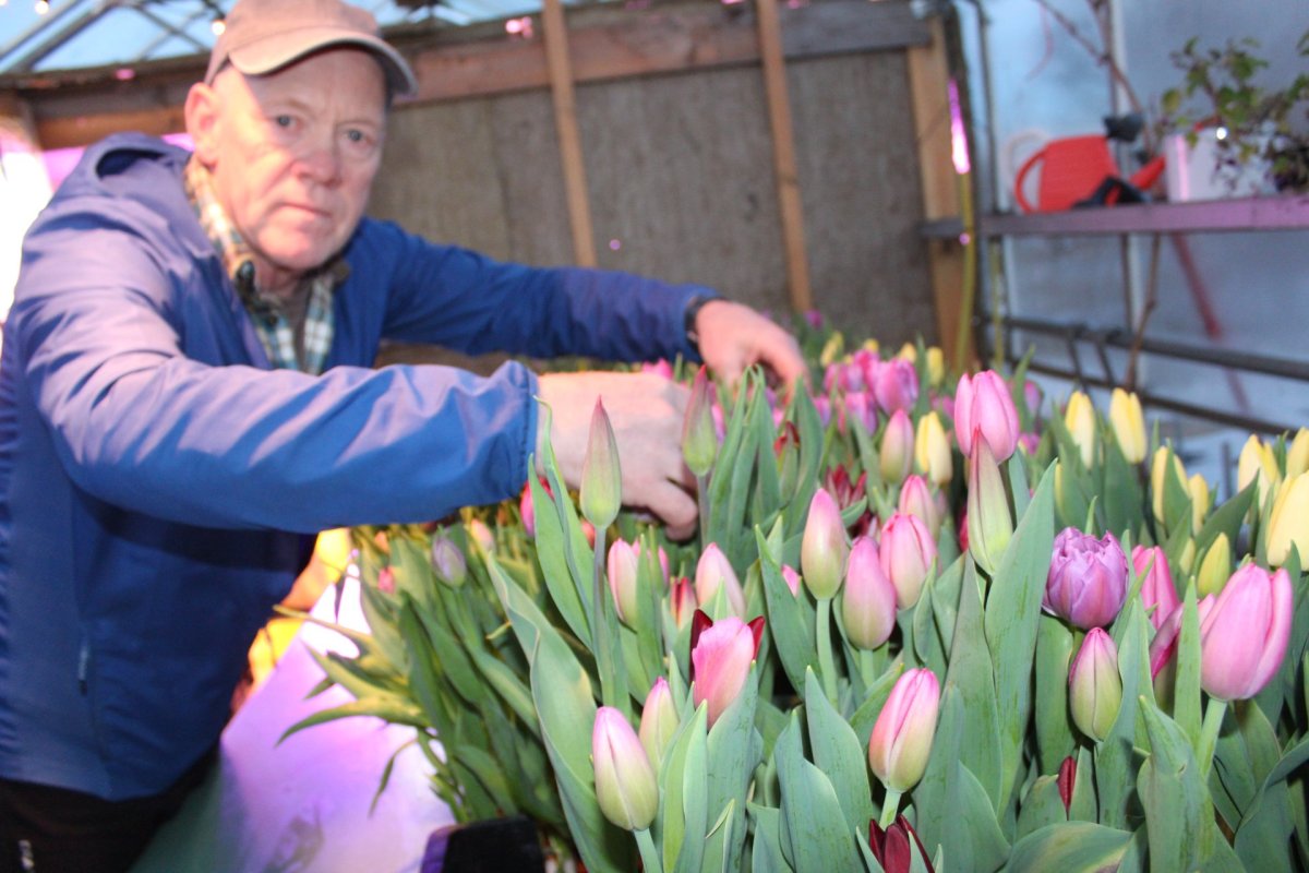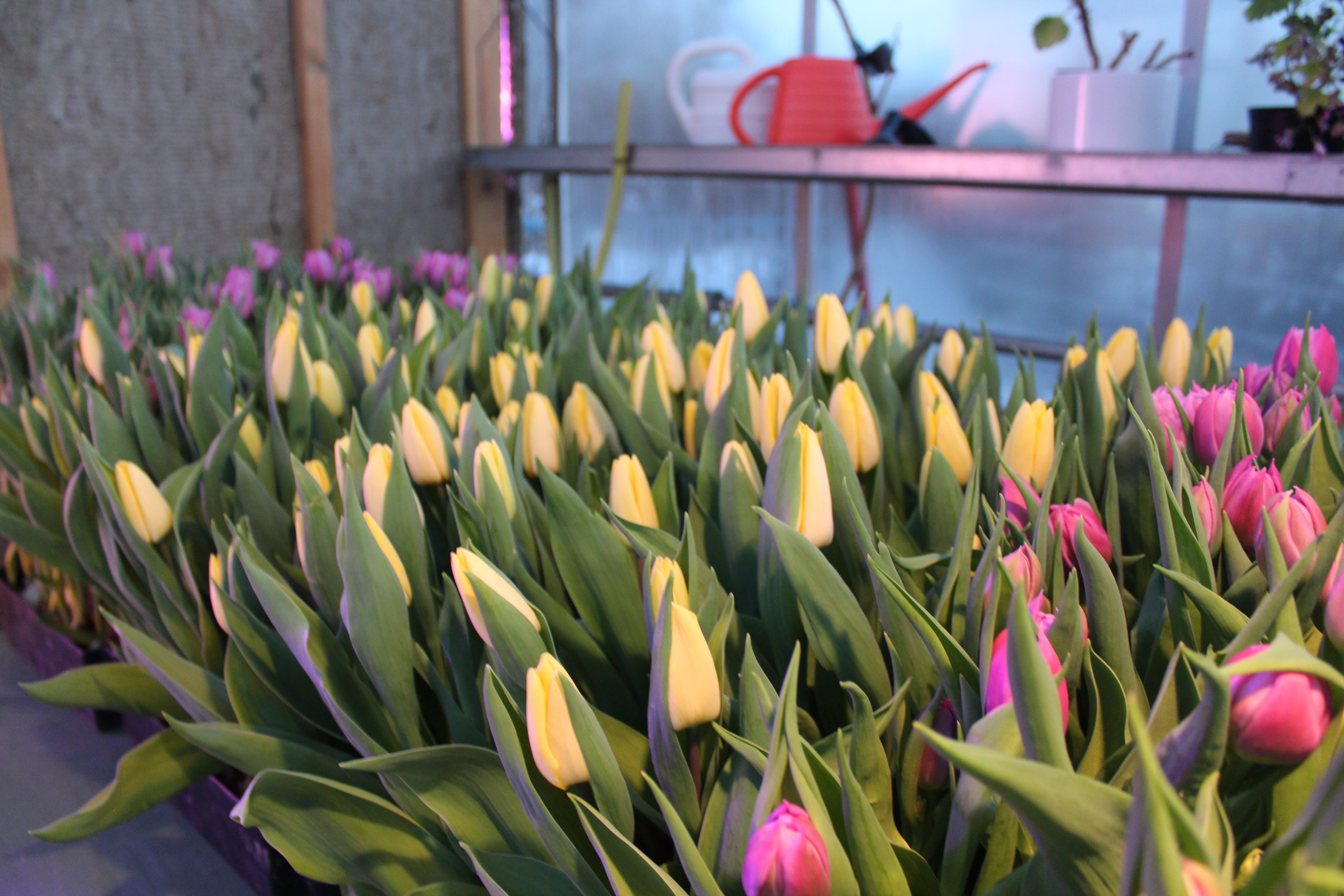 Í litlu garðyrkjustöðinni Kambsmýri 12 eru litríkir túlipanar að springa út og bíða eftir að bóndadagur renni upp. Hann er handan hornsins, rennur upp á föstudag og án efa verður víða fagnað.