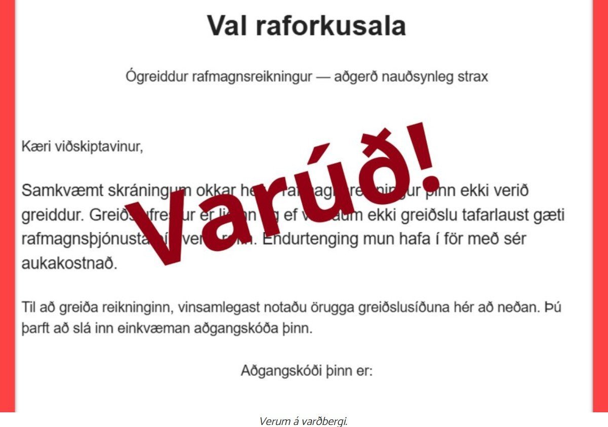 Norðurorka vekur athygli á svikapósti með fyrirsögninni Val á raforkusala, þar sem tilkynnt er um ógreiddan rafmagnsreikning. Í framhaldinu er viðtakanda boðið að smella á greiðslusíðu og slá inn kóða sem fylgir póstinum til að ganga frá greiðslu.