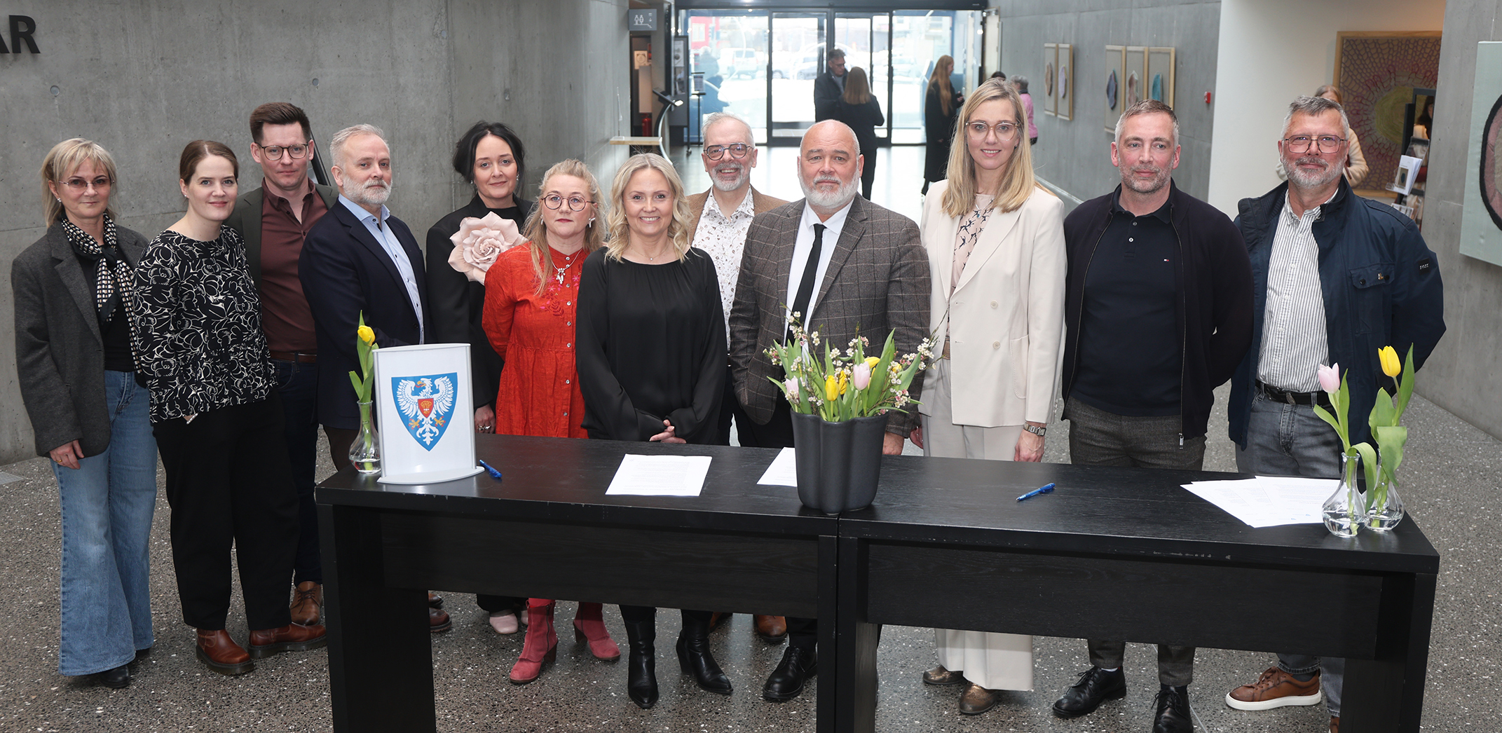 Að undirritun lokinni. Talið frá vinstri: Halla Björk Reynisdóttir forseti bæjarstjórnar Akureyrarbæjar, bæjarfulltrúarnir Jana Salóme Jósepsdóttir og Gunnar Már Gunnarsson, Bergur Þór Ingólfsson leikhússtjóri, Sigríður Örvarsdóttir safnstjóri Listasafnsins á Akureyri, Kristín Sóley Björnsdóttir viðburðastjóri Menningarfélags Akureyrar (MAk), Eva Hrund Einarsdóttir framkvæmdastjóri MAk, Þórgnýr Dýrfjörð forstöðumaður menningar-, markaðs- og atvinnumála hjá Akureyrarbæ, Logi Einarsson ráðherra, Ásthildur Sturludóttir bæjarstjóri, Heimir Örn Árnason formaður bæjarráðs og Preben Pétursson formaður stjórnar MAk