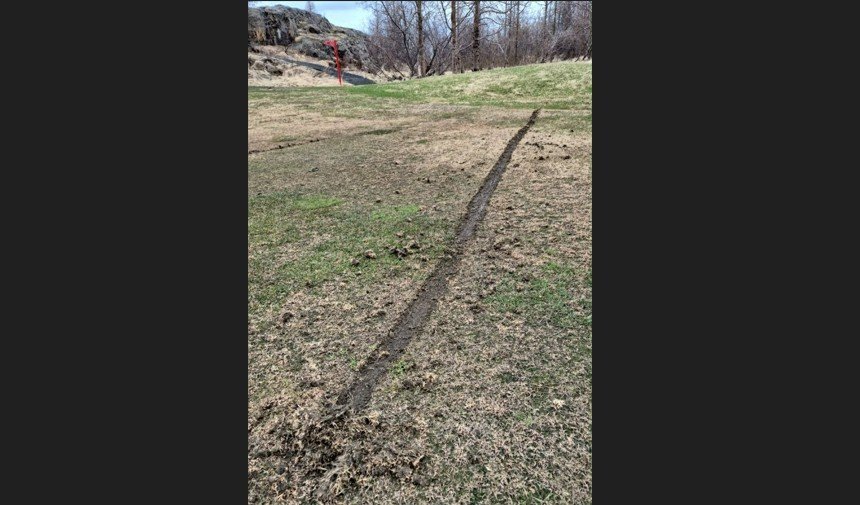 Að öllum líkindum er um sama óprúttna aðila að ræða og tætti upp 14. flöt síðastliðið haust.