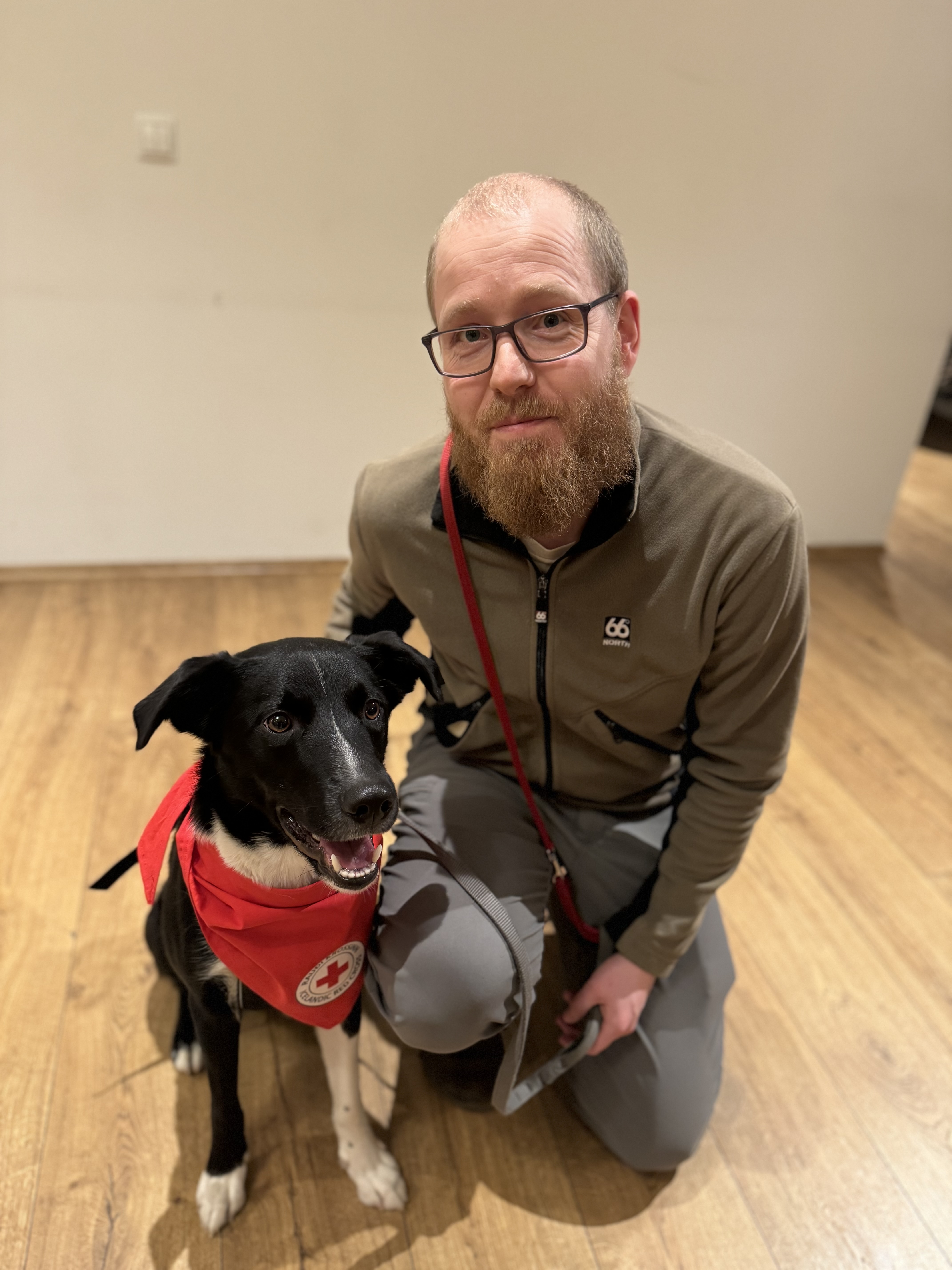 Hér er Rúnar með hund sinn Rayo en þeir eru sjálfboðaliðar í hundavinaverkefni Rauða krossins