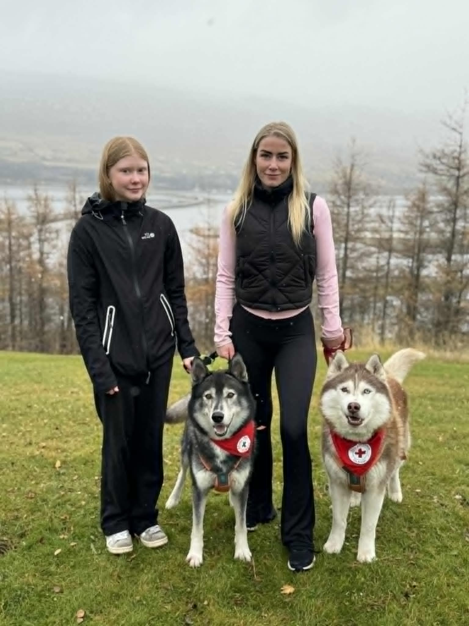 „Enginn heimsókn er eins, en þær eiga það allar sameiginlegt að vera yndislegar og mér verður hlýtt í hjartanu í hvert skipti,“ segir Sunna Valsdóttir sem er hundavinur á vegum Rauða krossins við Eyjafjörð. Hún hefur verið heimsóknarvinur með hund frá árinu 2022 og starfar nú sem hópstjóri í verkefninu sem hún segir að sé gefandi og skemmtilegt. Siberian Husky hundar hennar, Logi og Kolur vekja alltaf lukku þegar þeir mæta í Brekkukot en þangað mæta þeir með Sunnu sinu sinni í viku.