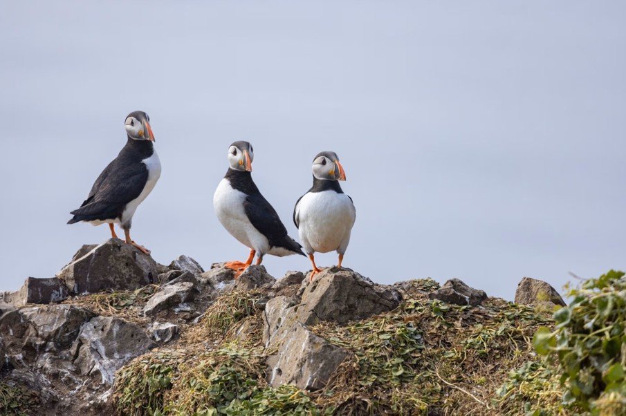 Fyrstu lundarnir mættu til Grímseyjar í dag, 9 apríl. Það sást til þeirra skammt fyrir utan ströndina í gær og í dag tóku systurnar Unnur og Halla Ingólfsdætur eftir þeim í björgunum suður við vitann.