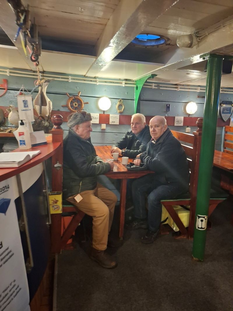 Ágúst Einarsson, Bjarni Bjarnason skipstjóri og Dagnýr M Marinósson á góðri stundu í laugardagskaffi Hollvina Húna.